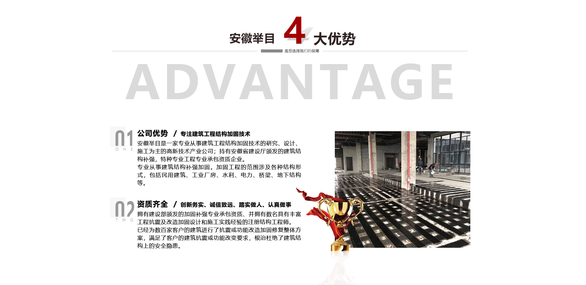 安徽舉目工程加固有限公司是一家專業(yè)從事建筑工程結(jié)構(gòu)加固技術(shù)的研究、設(shè)計(jì)、施工為主的高新技術(shù)產(chǎn)業(yè)公司,成立于2012年。持有安徽省建設(shè)廳頒發(fā)的建筑結(jié)構(gòu)補(bǔ)強(qiáng),特種專業(yè)工程專業(yè)承包資質(zhì)企業(yè)。專業(yè)從事建筑結(jié)構(gòu)補(bǔ)強(qiáng)加固。加固工程的范圍涉及各種結(jié)構(gòu)形式,包括民用建筑、工業(yè)廠房、水利、電力、橋梁、地下結(jié)構(gòu)等。公司依托高校土木建筑學(xué)院、省建筑科學(xué)研究機(jī)構(gòu)專業(yè)從事建筑結(jié)構(gòu)加固、檢測(cè)、鑒定、設(shè)計(jì)、施工、公司擁有建設(shè)部頒發(fā)...